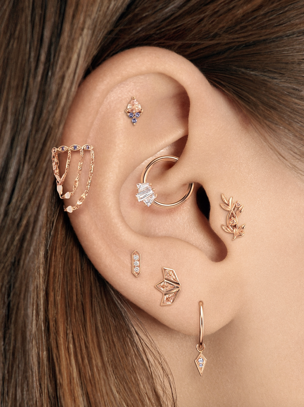 Discover the art of ear curation at Enigma Piercing in San Diego. Our highly experienced piercers combine aesthetic vision with precision to create a custom ear styling experience using only implant-grade, fine jewelry. Whether you’re new to piercing or curating your next look, we specialize in safe, luxurious body art.
