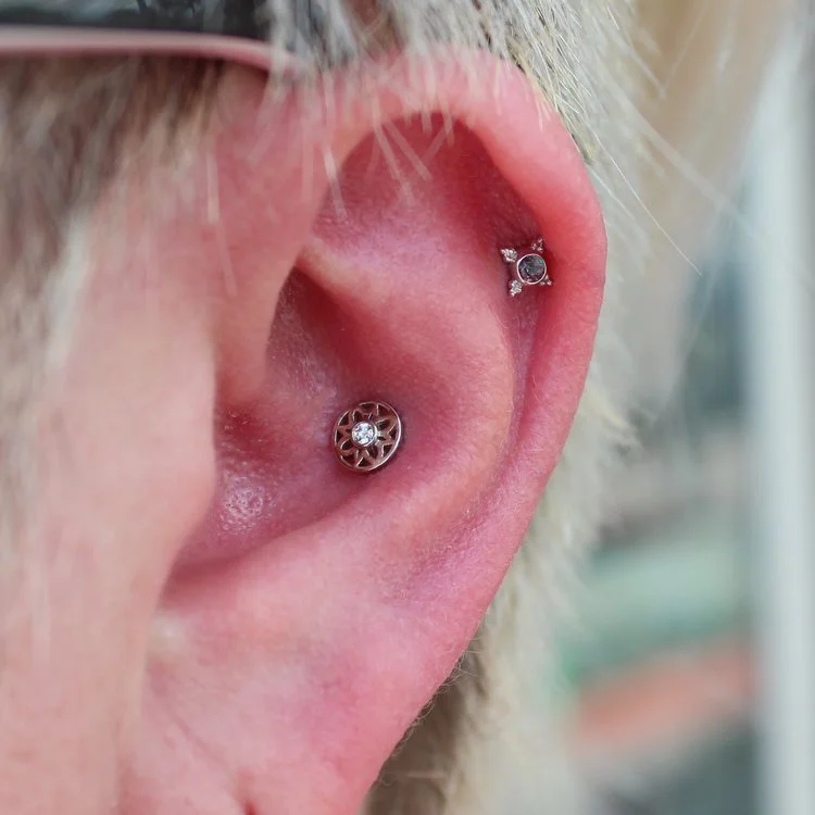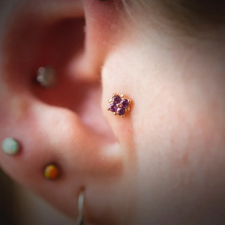 Floral gemstone ear piercing with star stud and gemstone — San Diego cartilage and lobe piercing specialist