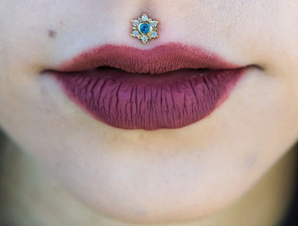Gold and diamond flower septum piercing with dark mauve lipstick — San Diego facial piercing specialist