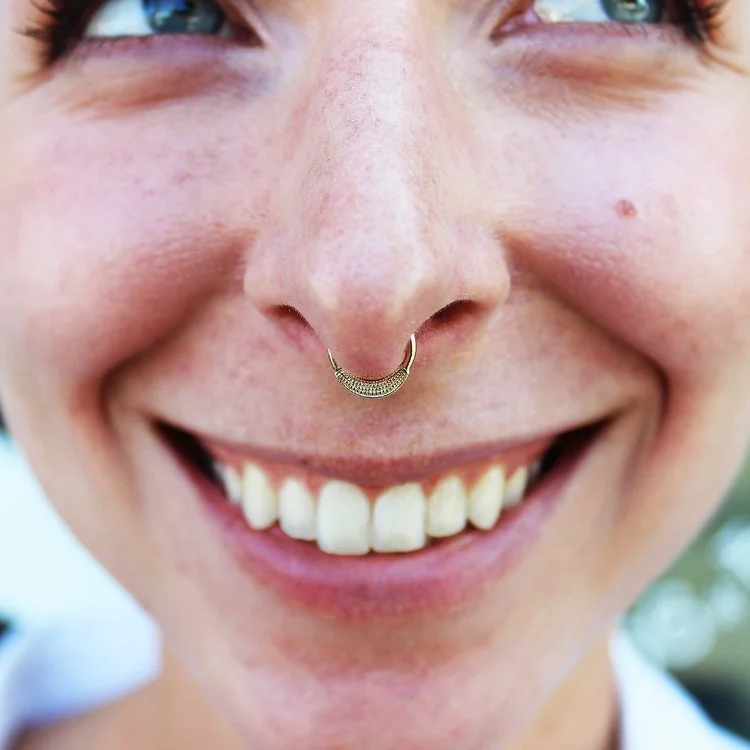 Smiling client with blue eyes showcasing a gold septum ring — facial piercing services in San Diego