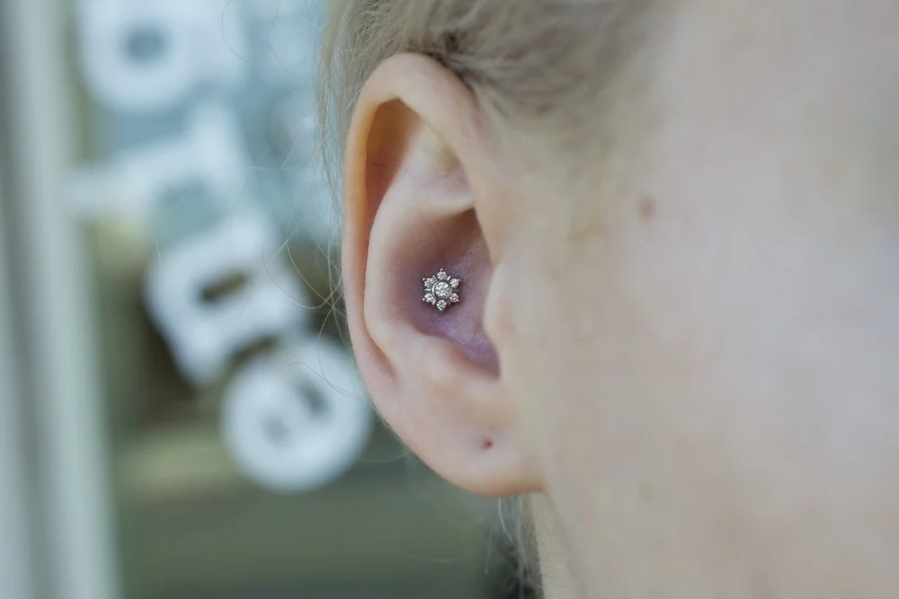 Diamond flower-shaped ear piercing with rose gold jewelry from top-rated San Diego piercing shop