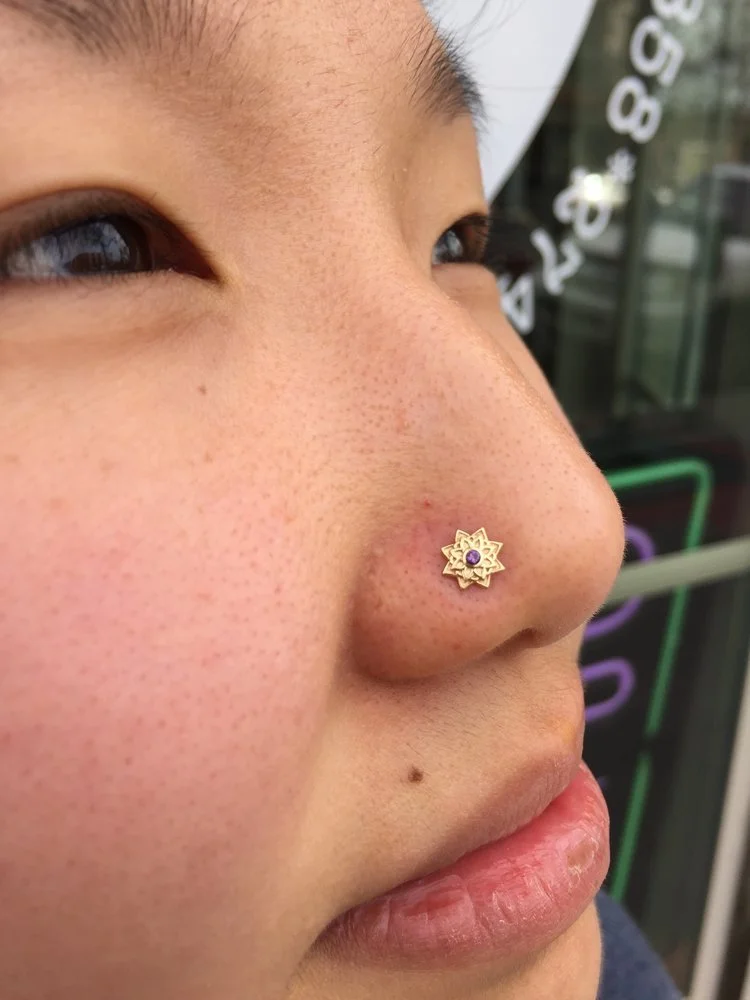 Gold flower-shaped nose ring with purple gemstone on client at San Diego piercing studio — precision nose piercing jewelry