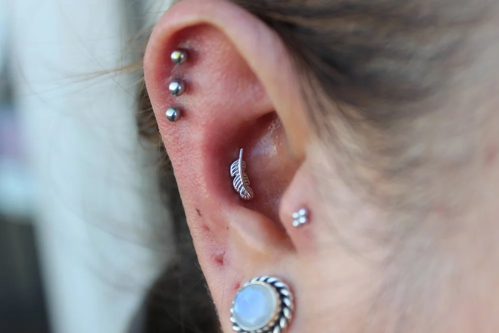 San Diego ear piercing with spiral cartilage barbell and silver studs by professional piercer