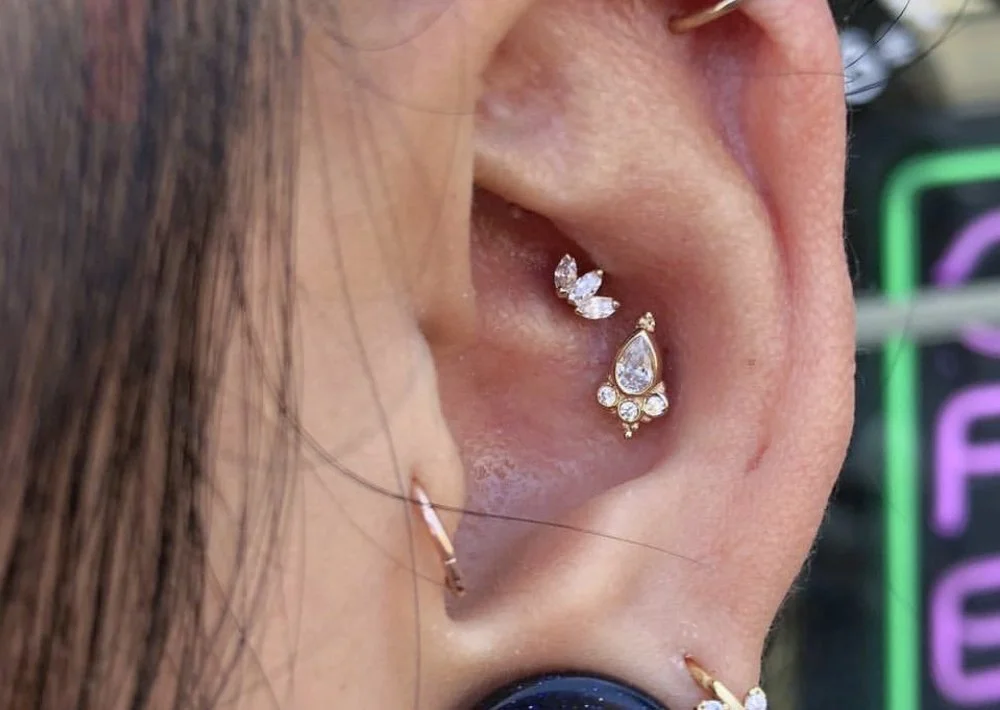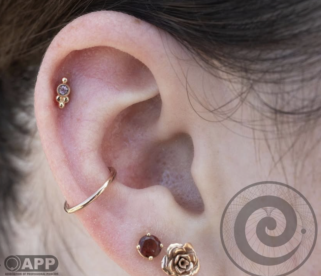 San Diego gold helix and gemstone ear piercing with floral stud — curated luxury ear styling by professional piercers