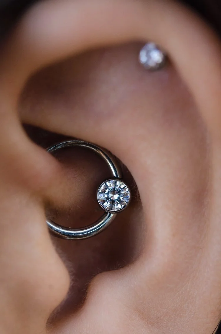San Diego ear cartilage piercing with dual gemstone studs — clear crystal helix and circular earlobe jewelry