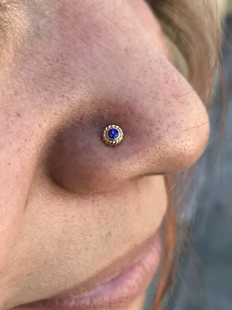 Close-up of gold septum piercing with vibrant blue gemstone — professional facial piercing in San Diego