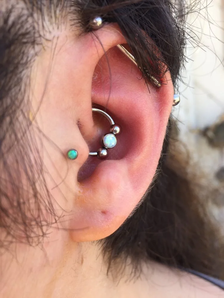 Multiple ear piercings in San Diego studio — helix, conch, and lobe jewelry in opal and metal styles